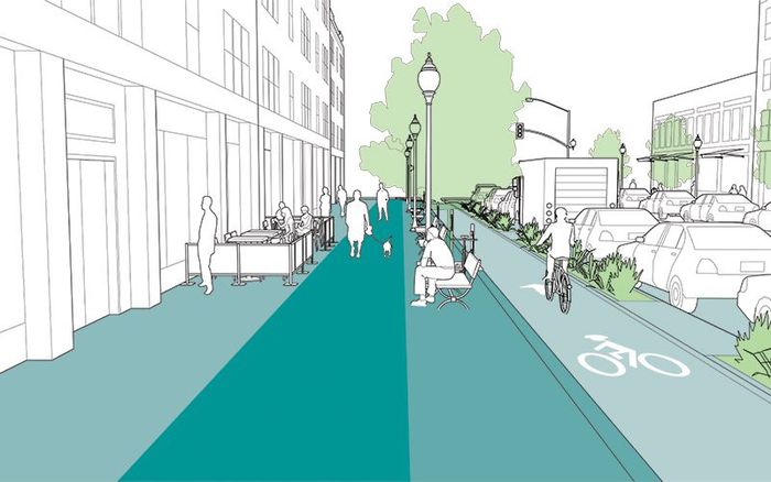 Sidewalk standards should accommodate higher anticipated pedestrian volumes and provide ample space for an expanded frontage zone. This includes street furniture, such as trash receptacles, bus stops, signage, and bike share stations. Image credit: NACTOBây giờ, đến lúc tưởng tượng lại không gian công cộng tập trung vào người một cách đáp ứng đầy đủ nhu cầu của tất cả người sử dụng. Chúng ta cần những thành phố nơi không gian cho người được ưu tiên hơn xe hơi và bãi đỗ xe. Nhiều thành phố đang biến khu trung tâm thành phố của họ thành khu dành cho người đi bộ. Hãy đưa thiết kế vượt ra khỏi khu vực trung tâm.