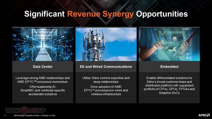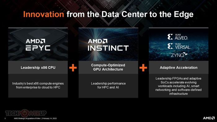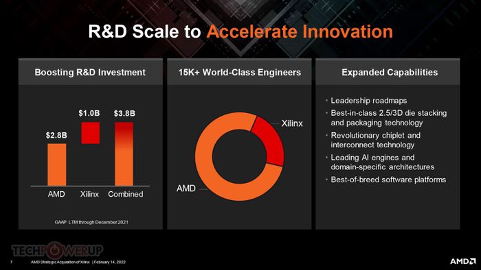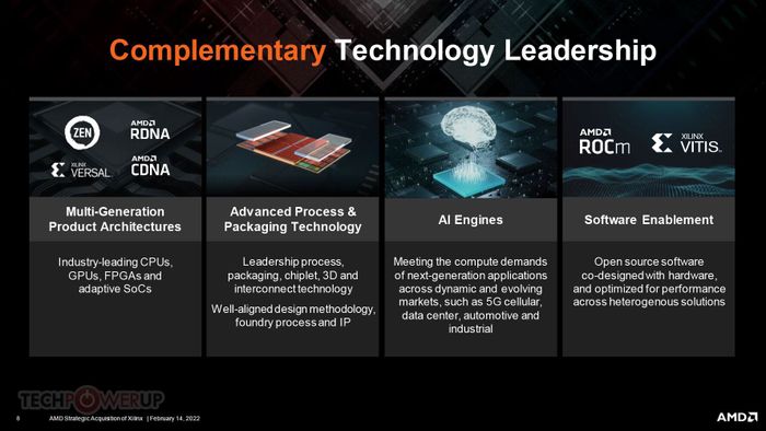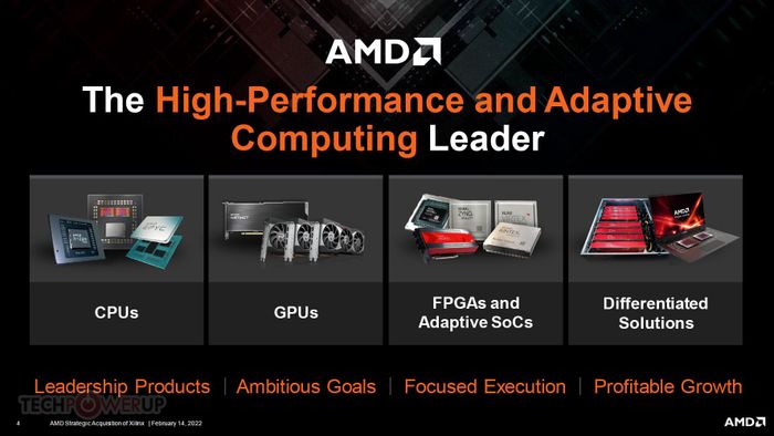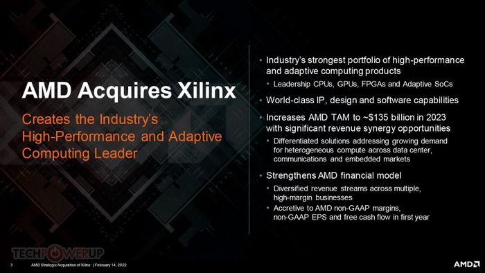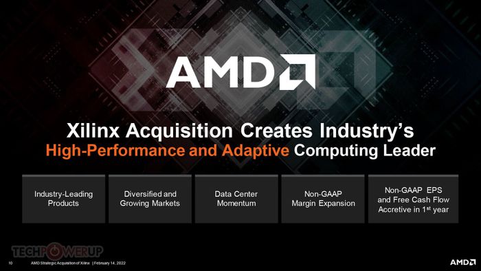 AMD đã chính thức thông báo hoàn tất việc sở hữu Xilinx thông qua việc mua lại toàn bộ cổ phiếu của họ. Thương vụ này được công bố lần đầu tiên cách đây gần 1.5 năm vào ngày 27/10/2020, với mục tiêu mở rộng quy mô và trở thành công ty hàng đầu về máy tính thích ứng và hiệu năng cao trong ngành công nghiệp. Tiếp theo, công ty sẽ tập trung đầu tư vào các sản phẩm SoC thích ứng với hiệu năng tính toán và đồ họa hàng đầu. AMD hi vọng thương vụ này sẽ dựa vào biên lợi nhuận non-GAAP, non-GAAP EPS và tạo ra dòng tiền tự do ngay trong năm đầu tiên. Ban đầu, thương vụ này được ước tính trị giá khoảng 35 tỉ USD, nhưng với sự tăng giá trị của cổ phiếu AMD đã đẩy giá trị giao dịch lên đến khoảng 50 tỉ USD.