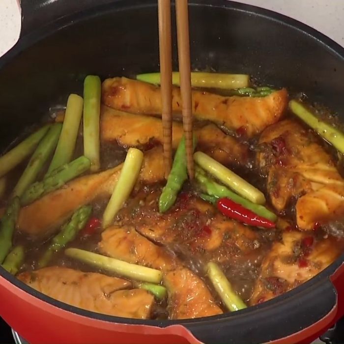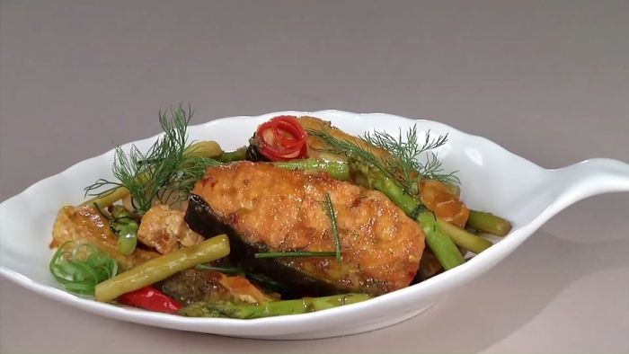 Món cá hồi kho xì dầu với Măng tây thơm ngon