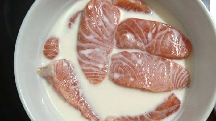 - Chuẩn bị cá hồi, rửa sạch và ngâm trong sữa tươi không đường để loại bỏ mùi tanh. Bạn cũng có thể sử dụng hỗn hợp nước cốt chanh pha muối hoặc rượu trắng với gừng băm nhuyễn để có mùi thơm đặc trưng.