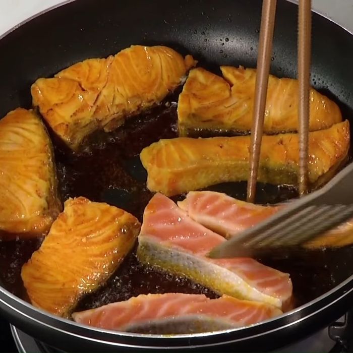 - Đun nóng chảo dầu, chiên cá hồi đã ướp cho đến khi mặt cá có màu vàng đẹp, sau đó vớt ra. Lưu ý gạt bỏ các gia vị để tránh cháy khi chiên.