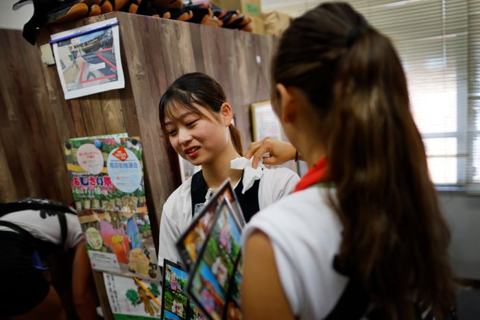 Riho Arai, 19 tuổi, đang phục vụ tại quầy đăng ký du lịch bằng dịch vụ xe kéo độc đáo.