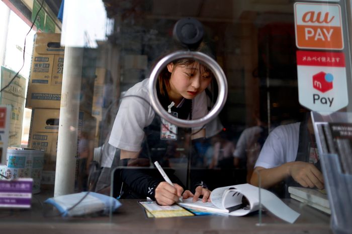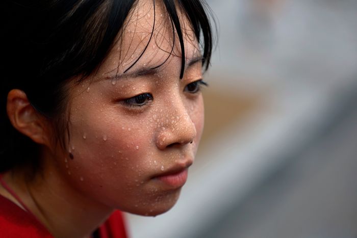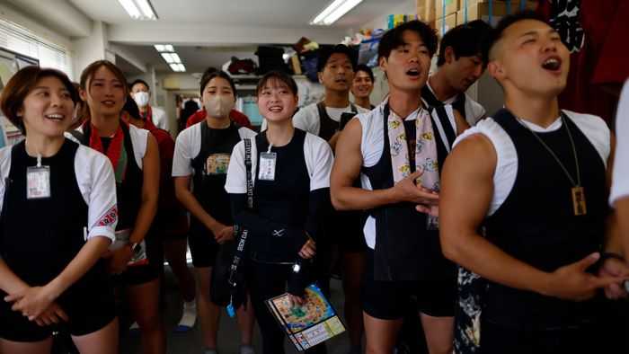 Riho Arai, 19 tuổi (bên trái), nhận sự giúp đỡ từ đồng nghiệp để lau sạch mồ hôi sau giờ làm, tạo nên tinh thần đồng đội và sự chia sẻ trách nhiệm.