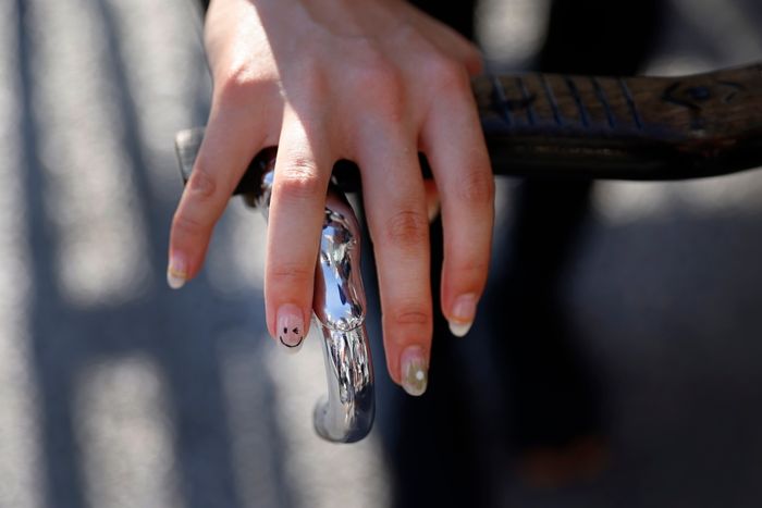 Nữ phu xe không chỉ tập trung vào việc kéo xe mà còn dành thời gian để làm đẹp cho móng tay của mình.