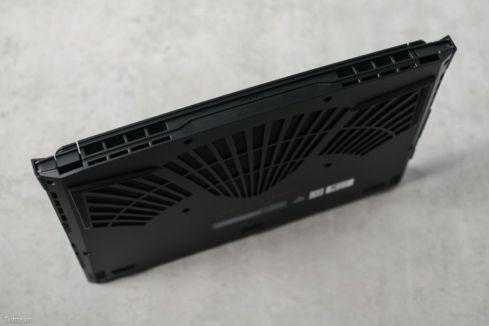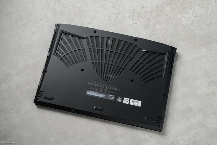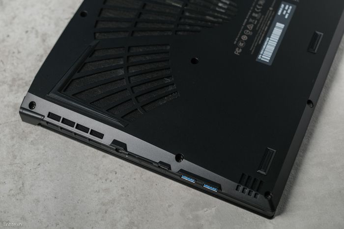 Phía dưới của AORUS 15P YD được thiết kế với khe lấy gió lớn để làm mát cho 2 quạt tản nhiệt. Mặt đáy là một tấm liền khối, dễ dàng mở ra để bảo trì hoặc nâng cấp phần cứng. Dưới lớp lưới, bạn có thể thấy quạt, 4 ống đồng, 2 thanh RAM SO-DIMM và thêm một khe M.2.