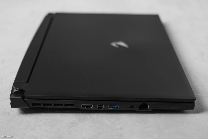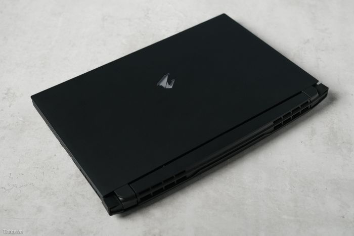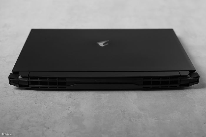 Mặt trước của laptop có hệ thống tản nhiệt mạnh mẽ với 2 hốc gió lớn, bản lề được thiết kế to và cầu kỳ, hình ảnh giống một chiếc phi thuyền với 2 phần gù lên dựa trên logo AORUS. Các cạnh bên được trang bị thêm hàng khe tản nhiệt và các cổng kết nối đa dạng.