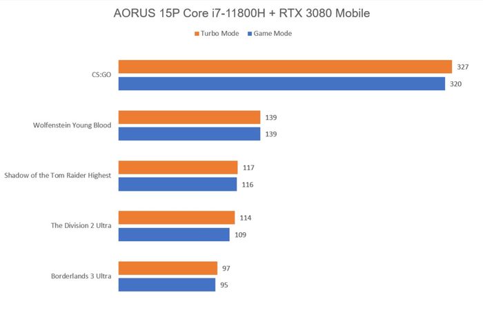 Hiệu năng của Aorus 15P được kiểm tra thông qua việc thử nghiệm một số game với 2 chế độ hiệu năng khác nhau: Game Mode và Turbo Mode. Sự khác biệt giữa 2 chế độ này phụ thuộc vào từng tựa game cụ thể.