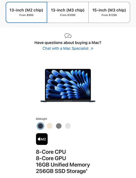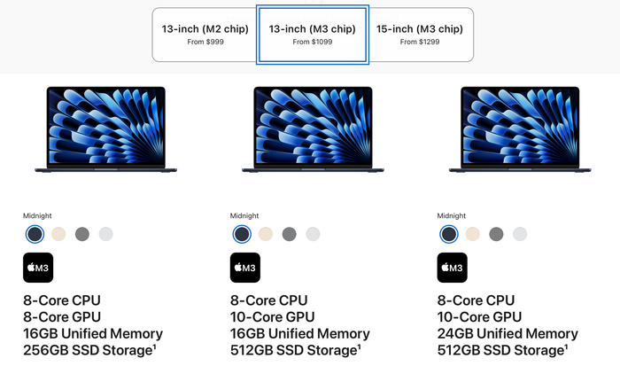 Cụ thể, tại Việt Nam, MacBook Air M2 có giá khởi điểm từ 24.99 triệu đồng, trong khi MacBook Air M3 có giá khởi điểm 27.99 triệu đồng. Ở cấu hình cơ bản, cả hai mẫu này đều đi kèm với 16GB RAM và SSD 256GB.