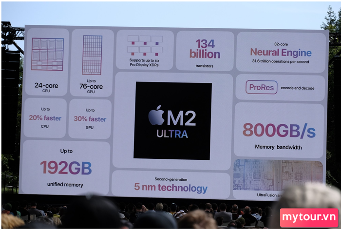 Apple cho biết M2 Ultra là con chip lớn nhất và hiệu năng cao nhất từng được tạo ra, biến Mac Studio và Mac Pro mới thành máy tính để bàn Mac mạnh mẽ nhất. M2 Ultra được chế tạo bằng quy trình 5 nanomet thế hệ thứ hai và sử dụng công nghệ UltraFusion đột phá để kết nối hai chip M2 Max, tăng gấp đôi hiệu suất.