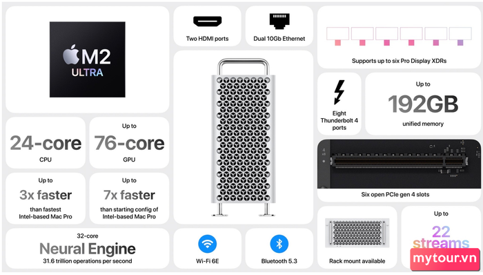 Toàn bộ dòng sản phẩm Mac của Apple hiện nay đã chuyển sang sử dụng chip Apple Silicon. Mac Pro có tám cổng Thunderbolt và 7 khe cắm PCIe, trong đó 6 khe hỗ trợ PCIe Gen 4 để mở rộng mô-đun. Giá cơ bản của Mac Pro bắt đầu từ $6999 (~165 triệu đồng).