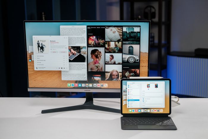 Trải nghiệm với Stage Manager sẽ thú vị hơn khi người dùng kết nối với màn hình ngoài (chỉ hỗ trợ cho iPad sử dụng chip M1). Lúc này, giao diện trên màn hình ngoài sẽ tương tự như khi sử dụng Mac.