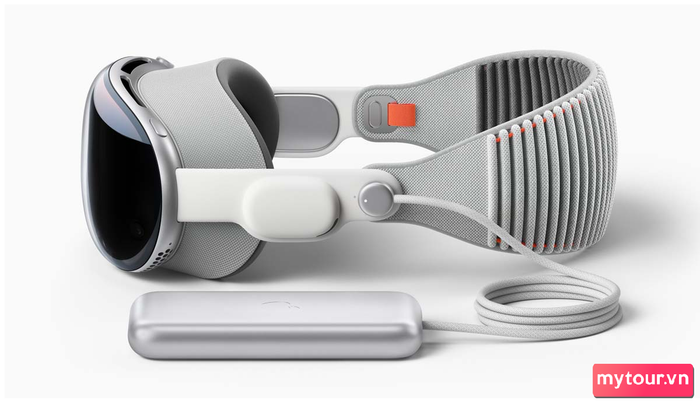 Toàn bộ mặt trước của thiết bị làm từ kính ôm trọn vào khung nhôm sang trọng. Phần trên của tai nghe có nút bấm và Digital Crown. Hệ thống module linh hoạt đảm bảo sự tùy biến tối đa, với các mặt có audiopods. Pin của Vision Pro có thể tháo rời và được kết nối thông qua kết nối từ tính với mặt bên của thiết bị.