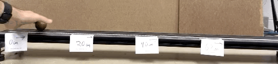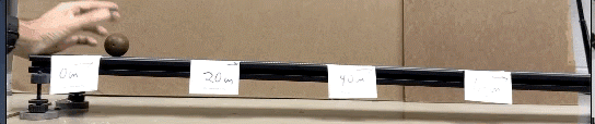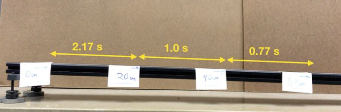 Lưu ý rằng tôi đánh dấu đoạn dốc theo đơn vị khoảng cách là 20 centimet. Điều này sẽ cho phép chúng ta xem xét xem quả cầu có lăn với tốc độ không đổi hay tăng tốc (mặc dù trong trường hợp này, chỉ cần nhìn thấy bằng mắt thường cũng khá dễ). Nếu quả cầu di chuyển với tốc độ không đổi, nó sẽ mất cùng một thời gian để đi qua cùng một khoảng cách. Được rồi, hãy làm điều này. Đây là thời gian mà nó mất cho mỗi khoảng cách.