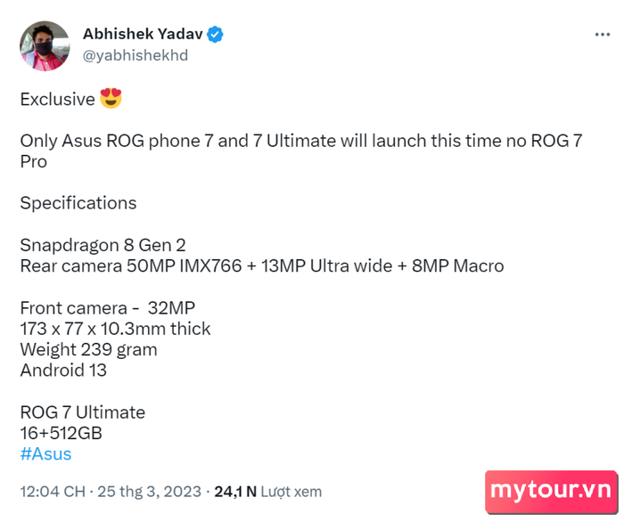Ngày ra mắt chính thức của ASUS ROG 7 series đã gần kề, với nhiều thông số kỹ thuật bị rò rỉ trước đó từ các nguồn đáng tin cậy như TENAA, 3C và Geekbench. Abhishek Yadav, người dùng Twitter, đã chia sẻ rằng phiên bản Pro sẽ không tham gia sự kiện, đồng thời tổng hợp lại nhiều thông số kỹ thuật quan trọng của sản phẩm.