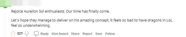 Nguyên nhân của việc này là do Ác Long Thượng Giới không phù hợp với meta cũng như các trận đấu thông thường. Ngay cả những người chơi yêu thích Aurelion Sol cũng phải thừa nhận rằng vị tướng này không hiệu quả. Vì vậy, sự xuất hiện của Ác Long trong danh sách này khiến không ít fan LMHT cảm thấy vui mừng.