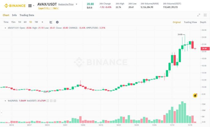 Biểu đồ 1 ngày của cặp tiền mã hóa AVAX/USDT trên sàn Binance lúc 11:45 sáng ngày 21/11/2023Những hợp tác của Avalanche với các tên tuổi lớn trong lĩnh vực tài chính như JP Morgan và Citi đang thúc đẩy AVAX tiến lên. Trong tuần trước, dự án Onyx của JPMorgan đã công bố hợp tác với Avalanche dựa trên sáng kiến 'Guardian' của Cơ quan Tiền tệ Singapore (MAS).