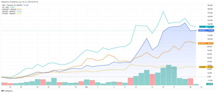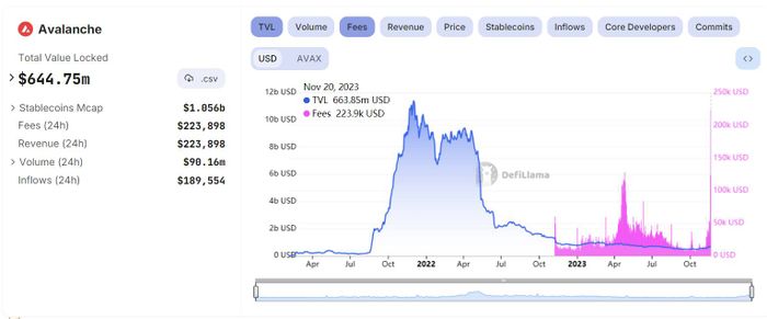 Liên kết giữa biến động giá ngày của AVAX với SOL, NEAR và ETH. Ảnh chụp màn hình CoinMarketCap vào trưa ngày 21/11/2023Khối lượng giao dịch hàng ngày trên mạng lưới cũng đang phát triển tích cực. Tổng giá trị khóa (TVL) của Avalanche tăng gần 20% trong tuần, vượt trội hơn cả Arbitrum. Tuy nhiên, dù có sự tăng trưởng này, phí giao dịch vẫn được duy trì ổn định và không có lượng tiền mới đổ vào hệ sinh thái này. Như Mytour đã tóm tắt, sự tăng giá của AVAX không ổn định, có thể do một số nhà đầu tư lớn đang tạo ra FOMO để bán hàng.