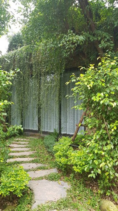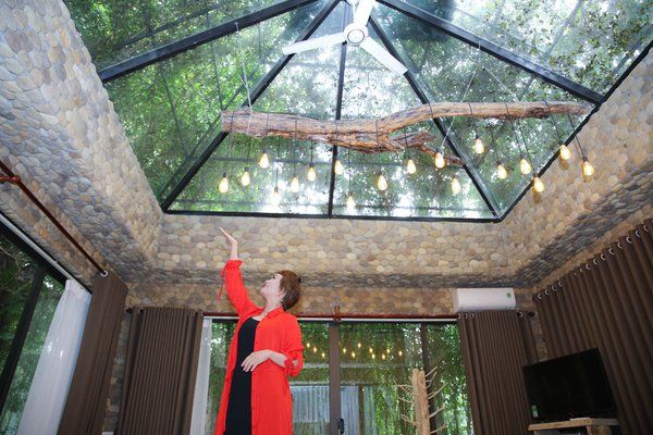 Với bức tường sỏi mộc mạc và kính trong suốt, Cẩm Tú Mai luôn tràn đầy ánh sáng, tạo không gian sang trọng, ấm cúng, kết hợp với nét đẹp ngây thơ của lớp lá xanh mơn mởn.