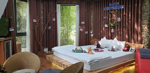 Bên cạnh đó, các bungalow được bài trí sáng tạo với nhiều mô hình độc đáo như cây hình chiếc Vespa, xích đu hình lồng chim, tổ chim, thuyền hoa tình yêu,... tạo nên không gian đầy ấn tượng và lý tưởng cho việc vui chơi và chụp ảnh.