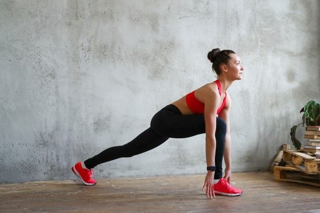 Giảm độ cao của trọng tâm cơ thể, chân phải tạo nên một góc 90 độ. Chân trái được duỗi thẳng và đặt 2 tay lên gối phải. Chậm rãi đẩy trọng lượng của cơ thể xuống với vài nhịp nhấn.