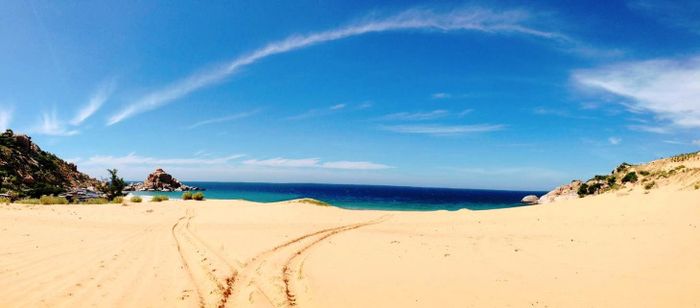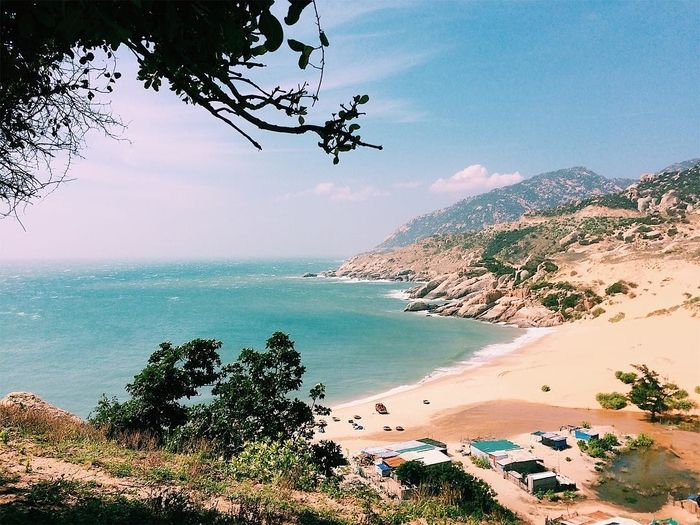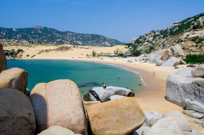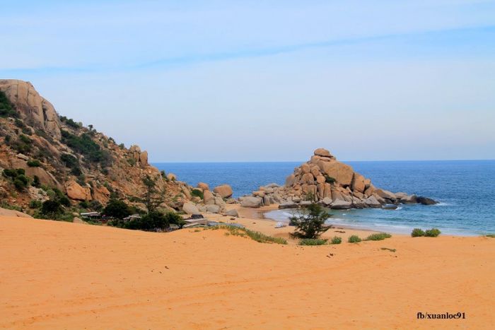 Sau đó, đỗ xe ở các quán nước ven đường, đi bộ khoảng 700m qua bãi cát trắng rộng như sa mạc dưới cái nắng nóng, bạn sẽ thấy Bãi Tràng - một bãi tắm nhỏ xinh tuyệt vời.