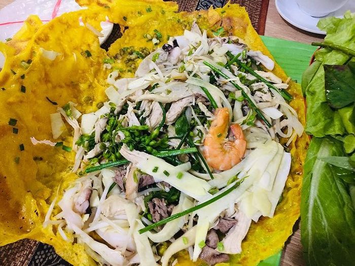 Một điểm độc đáo của bánh xèo tại đây là không sử dụng rau phổ biến như xà lách, rau thơm mà thay vào đó là những loại rau rừng như lá xoài, lá cóc. Hương vị và mùi vị lạ miệng, hấp dẫn khiến thực khách tò mò khám phá. Mặc dù có thể cảm thấy lạ lẫm ban đầu, nhưng sau mỗi miếng, bạn sẽ phải công nhận sự ngon miệng khó cưỡng.