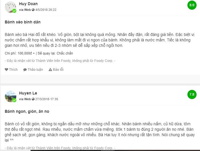 Quán bánh xèo Bà Hai có kích thước nhỏ nhưng để lại ấn tượng lớn với thực khách. Mọi người không thể quên hương thơm mùi bánh xèo, vừa to vừa ngon. Đặc biệt, cách Bà Hai tráng bánh đều như vắt chanh, tạo nên độ giòn đặc trưng. Không chỉ thế, nước chấm cũng góp phần tạo nên hương vị đặc trưng, không giống ai. Nếu bạn chưa thử bánh xèo ở đây, hãy ghé ngay hôm nay và thưởng thức nhé!