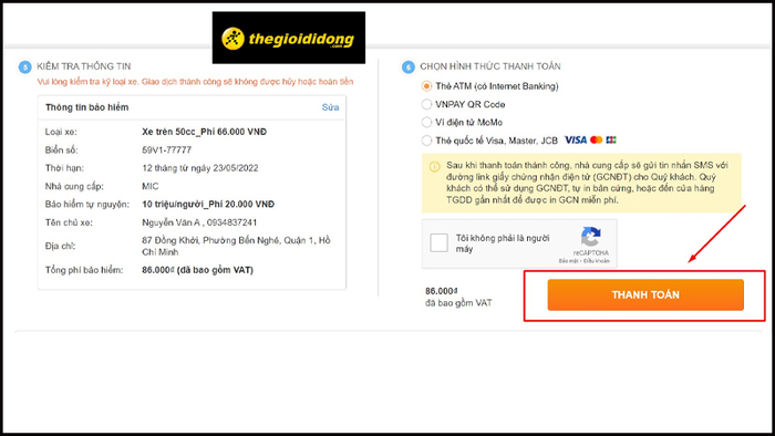 Bước 4: Kiểm tra cẩn thận thông tin đơn hàng và chọn phương thức thanh toán. Ở bước này, hãy xác nhận kỹ thông tin bảo hiểm, sau đó chọn phương thức thanh toán phù hợp và bấm vào Thanh toán