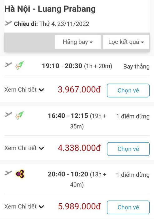 Ngoài ra, bạn cũng có thể chọn những chuyến đi có thời gian bay kéo dài từ Hà Nội đến Luang Prabang, với thời gian bay dao động từ 13 tiếng 40 phút đến 31 tiếng 20 phút.