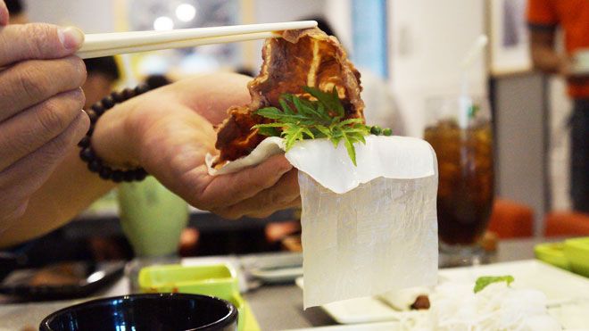 Một phần bò ngon đầy sức sống, với lát thịt cắt dày và thơm mùi thịt, một phần của màu sắc hấp dẫn. Thịt được cắt đều và dày dặn, khi gắp lên bằng đũa, bạn sẽ cảm thấy thích thú. Lớp thịt bò được đặt lên bánh tráng mịn màng, sau đó là lớp rau rừng đặc trưng và cuộn lại. Đặc biệt, ngoài lớp thịt bò và gân cắt đều, rau rừng còn được bày ra bàn với các loại đặc sản như đinh lăng, quế vị, lá cóc, cùng với vị chua giòn của thơm và dưa leo.
