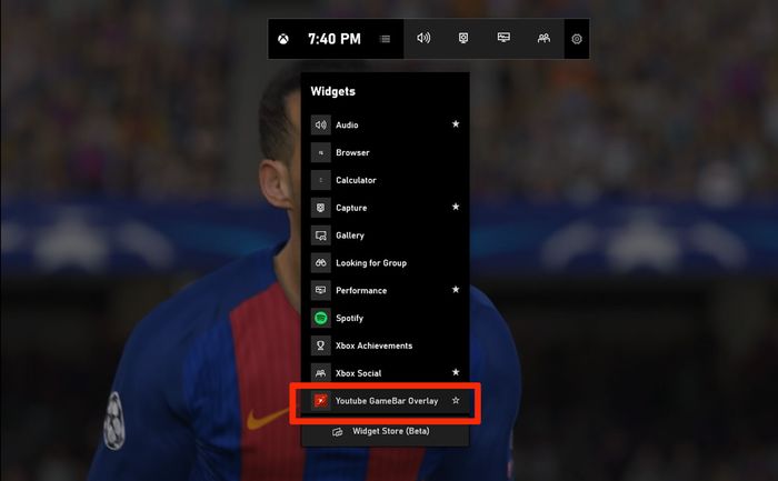 Khi đã cài đặt xong, anh em chỉ cần nhấn Windows + G trong game để mở thanh Game Bar. Tiếp theo, nhấp vào nút Menu Widget (ba gạch ngang), và chọn Youtube Gamebar Overlay.