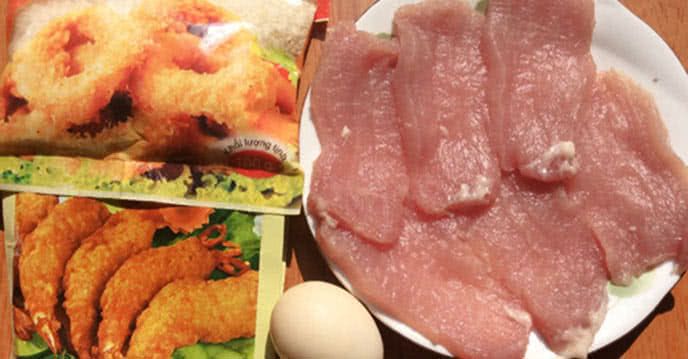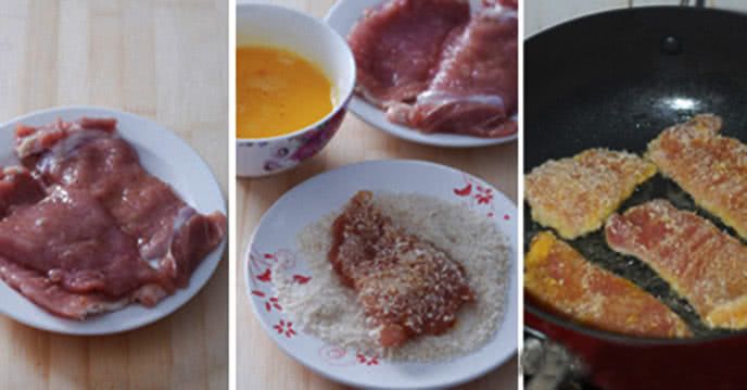 First, wash and slice the pork loin into 0.5 cm thick pieces. Then, marinate it with pepper, bouillon powder, and MSG for about 20 minutes. After marinating, coat the meat in crispy frying flour, dip it in beaten egg, and roll it in breaded frying flour before frying.