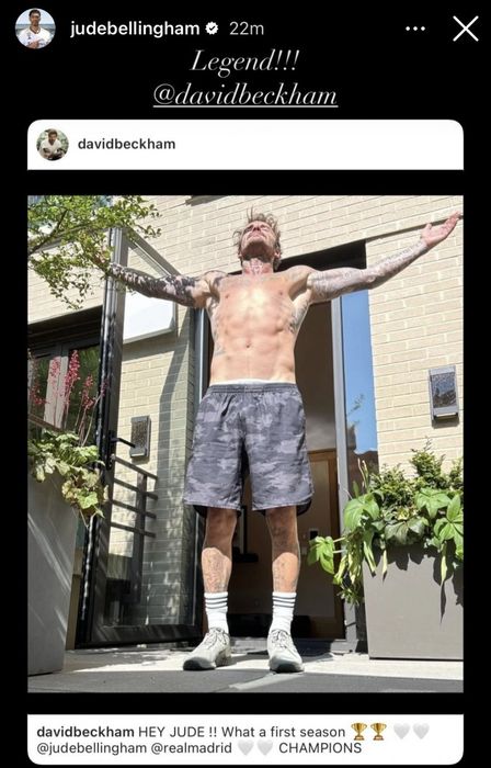 David Beckham, cựu cầu thủ của Real Madrid, đang thưởng thức cuộc sống tại Miami và đã thể hiện sự ngưỡng mộ đối với thành tựu của Jude Bellingham mùa giải qua. Trên trang Instagram cá nhân, huyền thoại số 7 của MU đã 'pose dáng' giống như cách Bellingham ăn mừng và ghi chú thích: “NÀY JUDE!! Mùa giải đầu tiên xuất sắc quá. NHỮNG NHÀ VÔ ĐỊCH!”. Beckham cũng không quên tag tên Real Madrid, nhà vô địch Champions League, trong bài viết của mình.