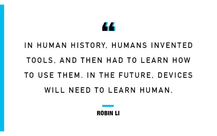 Tất cả điều này có nghĩa là Trung Quốc sẽ là một điểm nóng của phát triển trí tuệ nhân tạo trong tương lai gần. Li tin rằng anh ấy đang đưa Baidu vào con đường sở hữu cuộc cách mạng tiếp theo này - một cuộc cách mạng sẽ đưa Baidu lên vị thế đúng đắn của nó ở tầng quyển. Sớm thôi, Li tuyên bố, công ty của anh ấy sẽ mang lại công nghệ trí tuệ nhân tạo truyền tải mọi thứ và mọi hệ thống - từ y tế đến giải trí đến ô tô - với trí tuệ. “Trong lịch sử nhân loại, con người đã phát minh ra công cụ, và sau đó đã phải học cách sử dụng chúng,” Li nói với tôi. “Trong tương lai, thiết bị sẽ cần học cách làm người.”