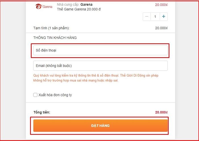 Bước 4: Nhập số điện thoại để nhận mã thẻ và nhấn đặt hàng.