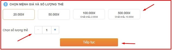 Bước 3: Chọn mệnh giá, số lượng thẻ (ít nhất là 1 thẻ, nhiều nhất là 10 thẻ trong một lần mua) và nhấn tiếp tục.