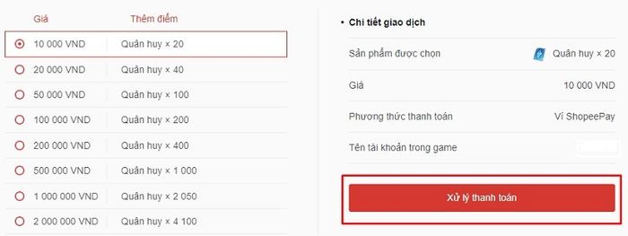 Thảo luận Bước 4: Lựa chọn mệnh giá bạn muốn nạp và xác nhận thông tin. Sau đó, nhấn "Xử lý thanh toán".