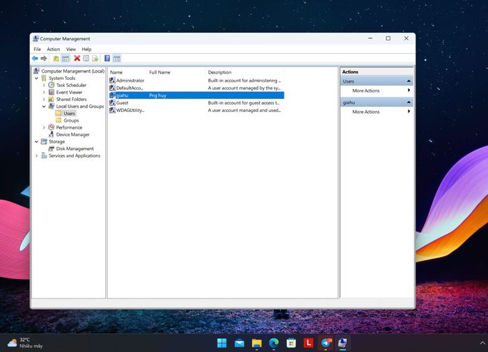 Mở Start Menu -> tìm Quản lý Máy tính -> chọn Người dùng và Nhóm cục bộ -> Người dùng, sau đó chọn người dùng cần xoá và click phải -> chọn Xoá. Với cách này, tài khoản người dùng sẽ biến mất, nhưng dữ liệu cá nhân vẫn an toàn.Xoá tài khoản người dùng qua Tài khoản Người dùng