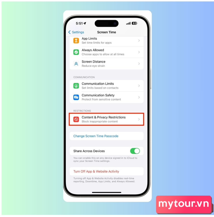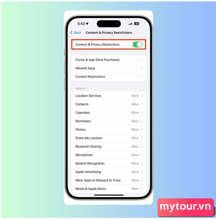 Bước 2: Nhấn vào Bật giới hạn (Content & Privacy Restrictions) để tiếp tục.