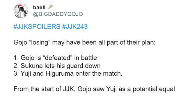 Một trong số đó là giả thuyết về việc cái chết của Gojo có thể là một phần của một âm mưu thông minh, đã được đề cập trên Twitter. Điều này cho thấy rằng thất bại của Gojo có thể là một phần của một kế hoạch phức tạp.