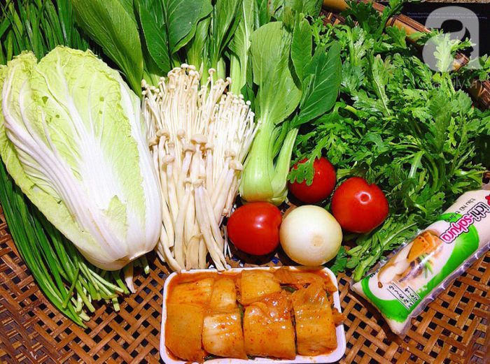 Bước tiếp theo: Sử dụng chảo khác, đun nóng dầu ăn, hành, tỏi, kim chi, cà chua, nấm hương. Xào chín để tạo ra nồi lẩu thơm ngon và hấp dẫn hơn.