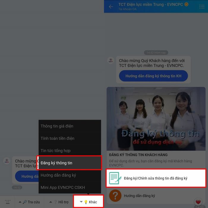 Bước 2: Trong cửa sổ chat với OA, đăng ký thông tin trong mục Khác hoặc Tra cứu và Hỗ trợ. Chọn Đăng ký/Chỉnh sửa thông tin đã đăng ký khi được yêu cầu.
