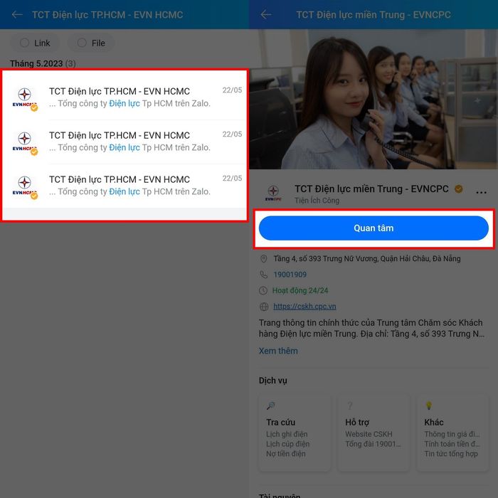 Bước 1: Trước tiên, mở Zalo trên điện thoại và tìm Tổng công ty Điện lực khu vực của bạn. Ví dụ, bạn có thể chọn Tổng công ty Điện lực miền Trung. Theo dõi OA và ấn nút Theo dõi.