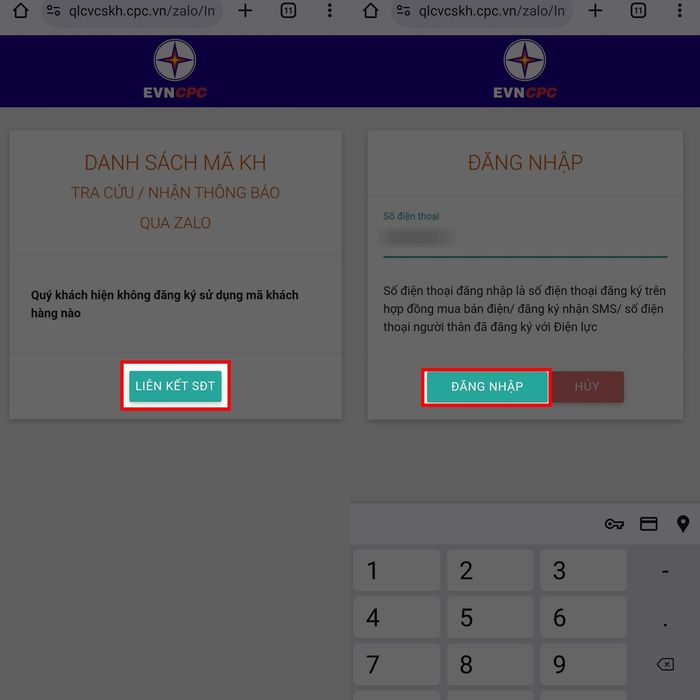 Bước 3: Chọn Thay đổi hoặc Liên kết SĐT, sau đó đăng nhập vào hệ thống. Từ nay, bạn sẽ nhận được thông báo hóa đơn tiền điện qua Zalo.