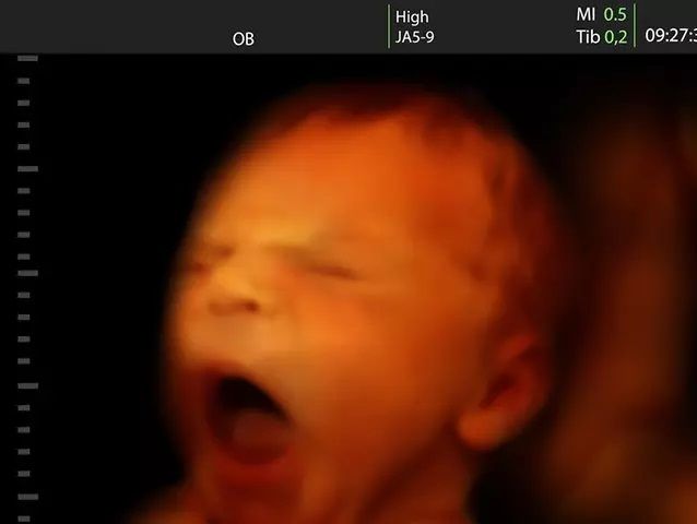 Ảnh siêu âm màu hiển thị em bé đang ngáp- Ngay sau khi sinh, da của em bé thường có thể sẽ xanh xao, nhưng sẽ trở nên hồng hào sau khi em bé thở, đây là dấu hiệu cho thấy phổi và hệ tuần hoàn của em bé hoạt động tốt. Da của em bé được phủ bởi dịch nhầy và nước ối, nước ối giúp cơ thể em bé thích nghi với môi trường bên ngoài cơ thể mẹ, ngăn không cho cơ thể mất nước và chống lại vi khuẩn.