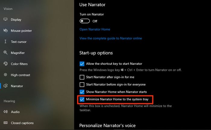 Nhưng khi ta vào Settings > Ease of Access > Narrator sẽ thấy một tuỳ chọn gọi là Minimize Narrator Home to the system tray.