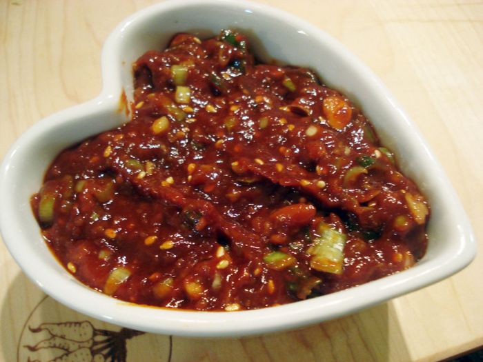 Pha chế bằng cách hòa quyện 2 muỗng tương ớt và 2 muỗng dầu mè. Thêm hành tây và tỏi băm vào, sau đó trộn đều với hạt vừng đã rang.