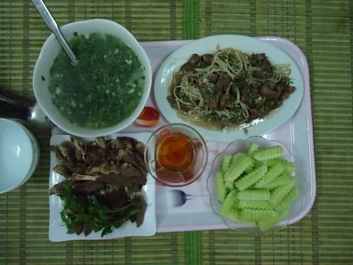-Bữa 5: Trứng hấp thịt, lòng gà xào giá, canh rau dền.