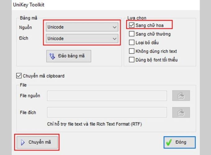 - Trong phần Bảng mã, chọn Nguồn và Đích là “Unicode”.