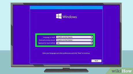 Chọn ngôn ngữ và khu vực. Khi cửa sổ cài đặt Windows xuất hiện, chọn ngôn ngữ, khu vực và các tùy chọn khác tại đây.